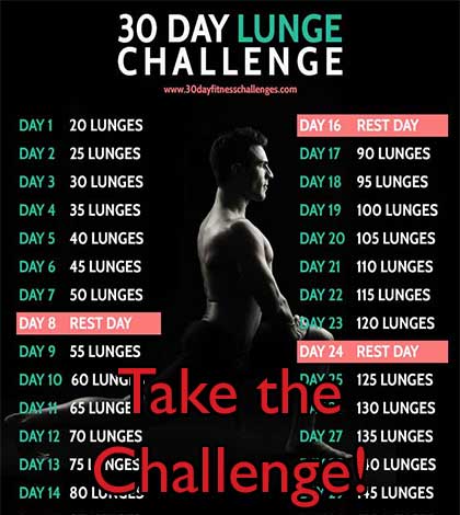 Want great legs and a rocking booty? Take the 30 day lunge challenge! Starts easy and ends with a killer 300 lunges. Rock that fitness challenge.