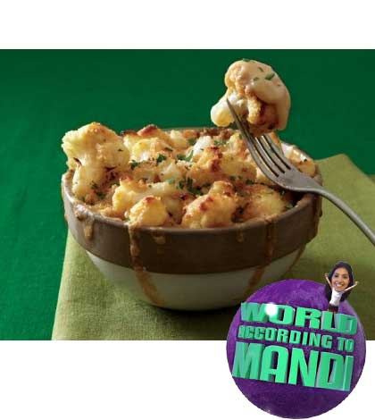 Next you make the yummy, but healthy, cheese sauce. Don’t forget to preheat your oven first (400 degrees). In a small bowl, mix together a half-cup of Fage Greek yogurt and a wedge of Laughing Cow Cheese. Add just a little more Franks Red Hot, but if you aren’t into spicy then skip the hot sauce. Next add the yogurt mixture to the cauliflower and mix it all around. Top the cauliflower with a little more cheese, such as 2 oz of chopped low fat cheddar (preferably not a lot more cheese to avoid unnecessary calories). Bake the bad boy for forty minutes at 400 degrees, or if your oven runs hot, do it at 375.