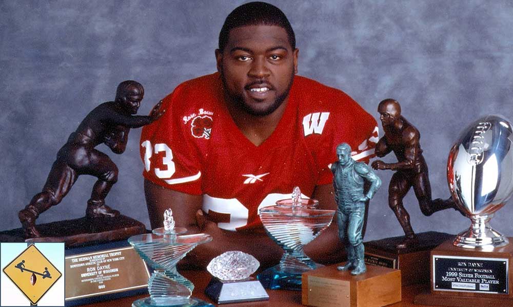 Dayne throws Pumphrey a little dap and then immediately crushes the kid back to earth. That is because Pumphrey’s all-time “record” is 6,405 yards, which includes his four seasons at SDSU, all regular seasons and bowl games. #7125 refers to Dayne’s rushing total from his four years at Wisconsin, only the NCAA doesn’t include his bowl yardage in its record books.