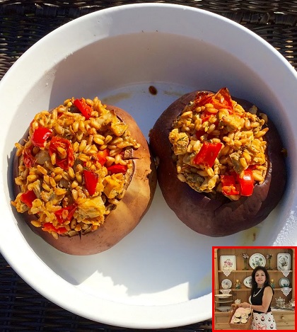Eggplant is one of my favorite veggies, and for this recipe the round ones are ideal. You can stuff eggplant so many different ways, and with these round beauties I went for a simple stuffing using eggplant, scallions, garlic, basil, red pepper, cherry tomatoes, and Farro. Farro is an Italian grain that gives a nutty flavor to the stuffing. I serve these eggplants as a main dish, with salad and fresh-baked bread.