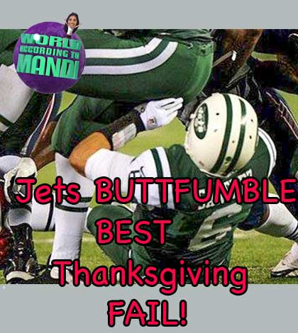 The Jets had the GREATEST fail of all time three Thanksgiving ago against none other than the New England Patriots. A buttfumble, yes…Mark Sanchez ran into his own guard and fumbled the ball. On this hilarious play the Patriots returned this fumble for a touchdown! AMAZING!