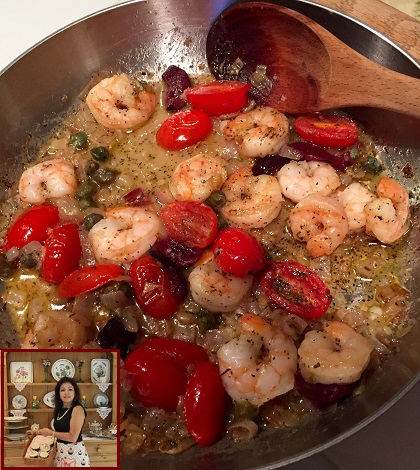 Stir in olives, capers, lemon juice and shrimp. Continue cooking for five minutes until shrimp is cooked, stirring to blend all the flavors.