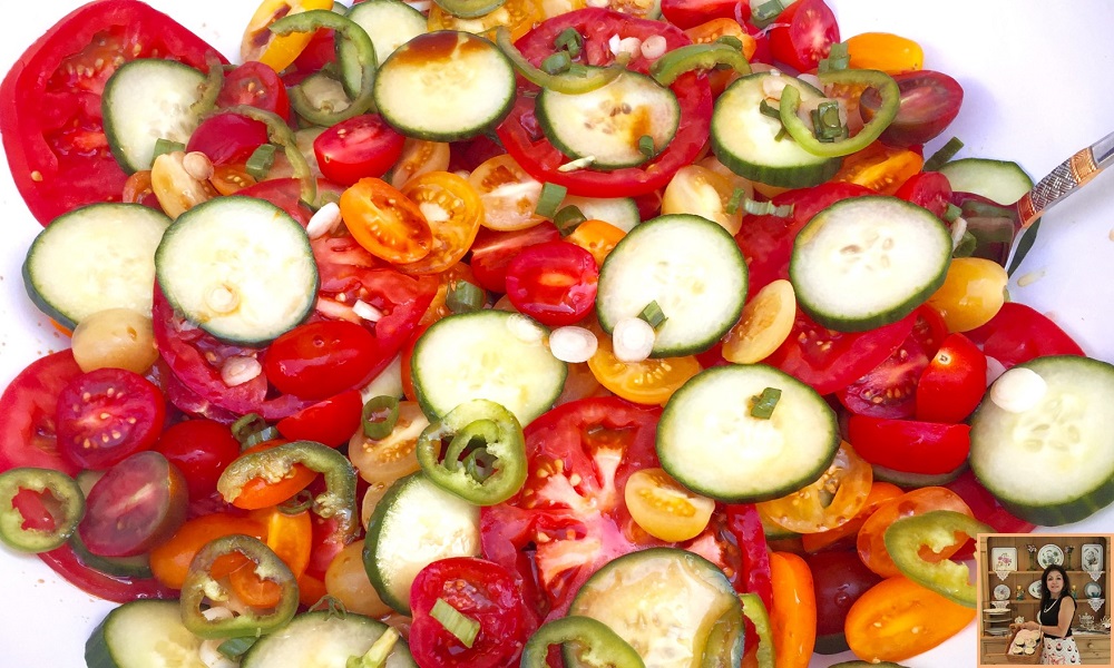Delicious, fresh picked tomatoes and the cool vibes of cucumber are a delight. My tomato and cucumber salad captures them together in a dish that embodies the essence of summer. Its cool and crisp, with added spice and a bit of crunch. The mixture creates a refreshing salad that compliments both meat and fish.