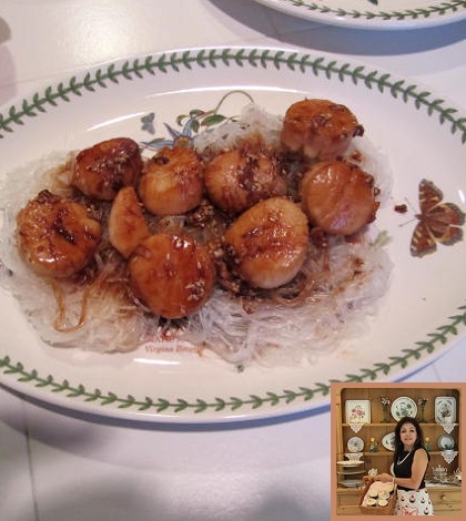 Cook cellophane noodles according to package instructions. Place cooked noodles on plate. Top noodles with cooked sea scallops.