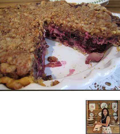 Think blueberries baked in a rich custard, surrounded by pie crust, and topped with a cinnamon walnut crumb topping. Rich, rich, rich!