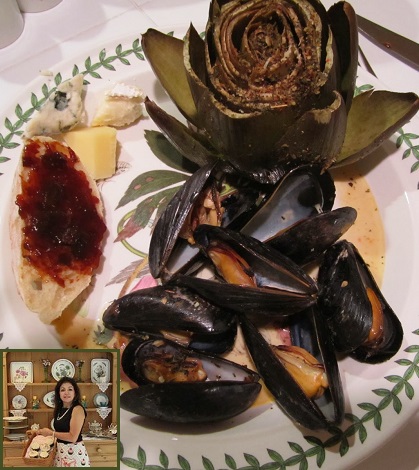 My end of summer Sunday Bistro Dinner includes: Mussels, Cheese plate, Steamed artichokes, and french bread. Oh, I almost forgot. Stonewall Kitchen Fig and Ginger Jam as well!