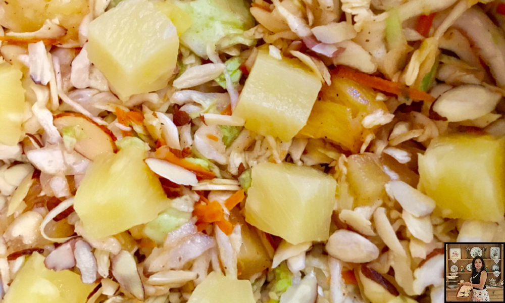 To create the crunchy, tangy, sweet and sour taste of this coleslaw I added pineapple, almonds, soy sauce, a hint of garlic, and a touch of Chinese Five Spice. Amazingly, I always find the perfect combination when creating a new fusion of spices. This Sweet and Sour Coleslaw recipe is a new, outstanding, addition to my summertime salad repertoire. Make sure you add it to yours!
