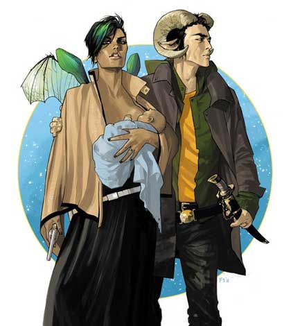 In the midst of an interplanetary war, two soldiers from opposing sides fall in love and have a child. Though both are basically humanoid, Mom has dragon wings and comes from a technology-based civilization, while Dad has ram’s horns and an affinity for magic. Together they run from the larger conflict, which involves a race of television-headed creatures that may or may not be mechanical.