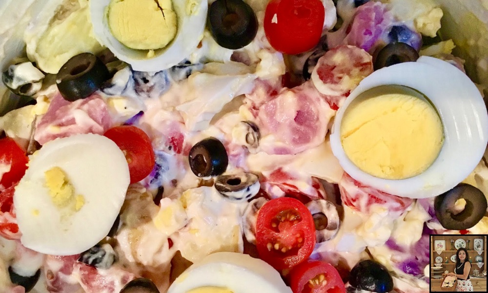 - Whisk mayonnaise, yogurt, mustard, garlic powder, pepper, and remaining ½ tsp. salt in a large bowl. Add potatoes, eggs, tomatoes, half of olives. Fold gently until combined and completely coated.